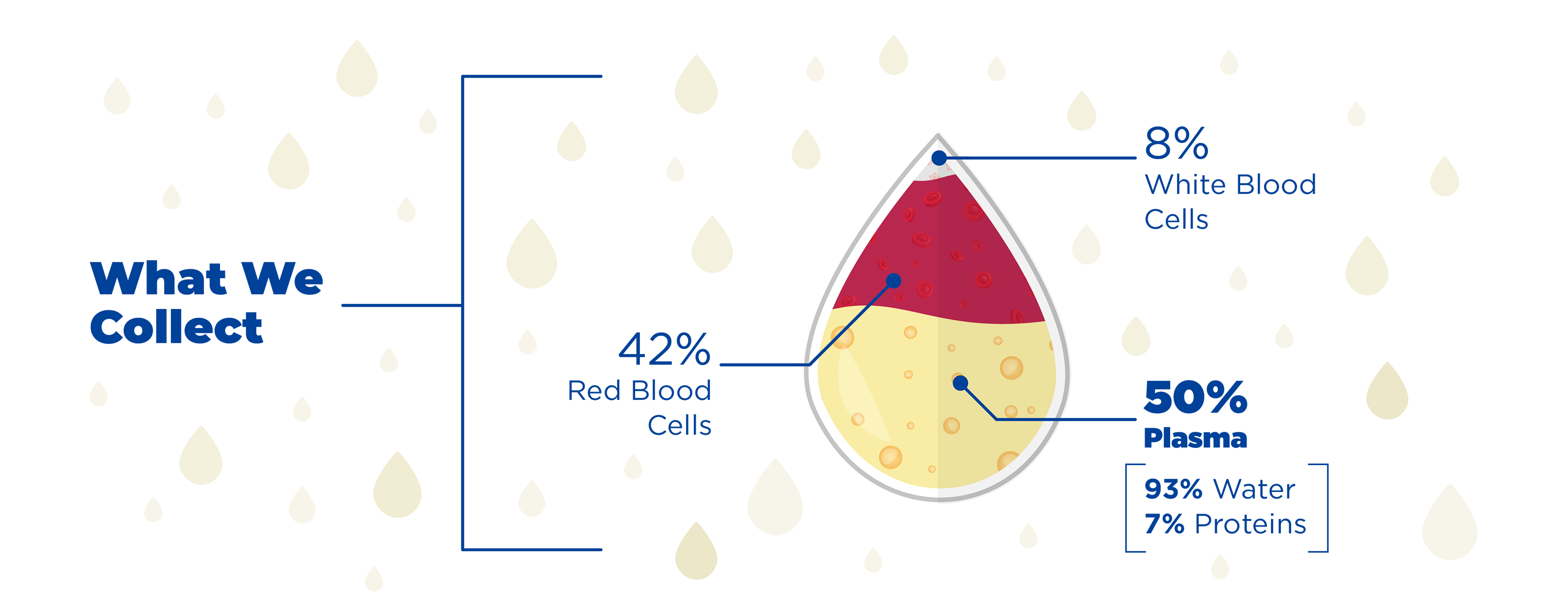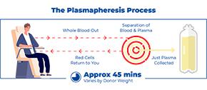 Donating plasma isn’t like donating whole blood. When you donate plasma, a safe process called plasmapheresis (pronounced PLAZ-mah fair-EE-sis) separates plasma from the rest of your blood. While it can take up to eight weeks to recover from a whole blood donation, your body quickly and easily replaces the donated plasma within 48 hours. As a result, you can safely donate plasma twice in a week, with donations two days apart from each other. Grifols uses your plasma donations to develop medicines that help save and improve lives.