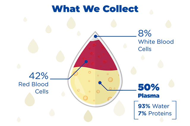 Plasma is the liquid portion of your blood that contains water, salts, enzymes, antibodies and other proteins that help our bodies function. It’s the single largest component (about 55%) of human blood and is what remains after red blood cells, white blood cells, platelets and other cellular components are removed.