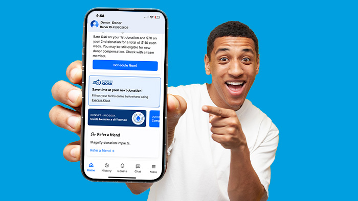 Comparte la buena vibra de donar plasma y obtén recompensas increíbles para todos. Todo es mejor con amigos, incluso donar plasma.